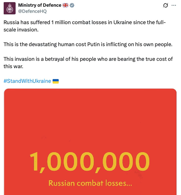 In Russia’s full-scale war against Ukraine which began in 2022, the invaders today sustained their millionth casualty.