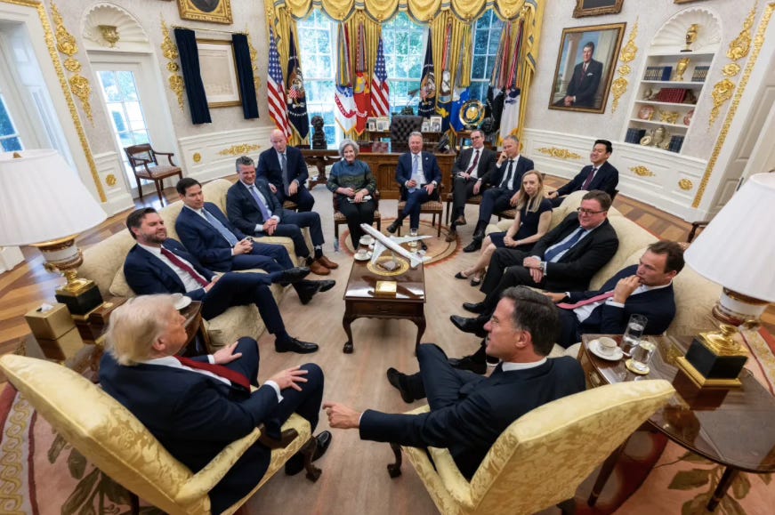 (Trump and NATO secretary general Mark Rutte, with delegations, in the Oval Office)
