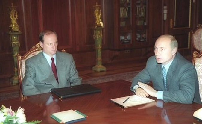 (Patrushev and Putin meeting in the Kremlin on August 9th, 2000, after an explosion rocked a shopping arcade in downtown Moscow)
