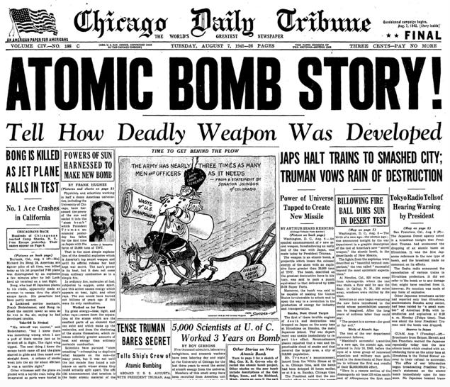 (Front page of the Chicago Daily Tribune from August 7th, 1945)