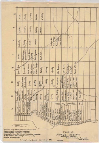 (The 1836 surveyor’s plan of the Huron Reserve, which became Anderdon township, showing names of Wyandot landholders.)