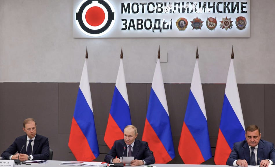 (First deputy prime minister Denis Manturov (left) and presidential aide Alexei Dyumin (right) with ‘Putin’ at ‘Motovilikhinskiye zavody’ – one of Russia’s oldest arms producers, founded by Empress Anna in 1736. This events took place on September 19th, 2025, which has been ‘gunsmiths’ day’ in Russia since 2011.)