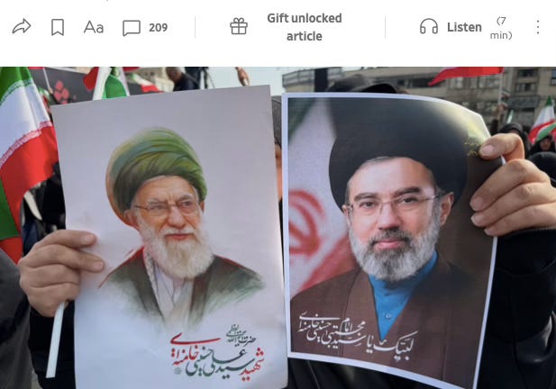 (Posters of new Iranian supreme leader Mojtaba Khamenei, who today promised to retaliate for every death, and his deceased father in Tehran on March 9th, 2026.)