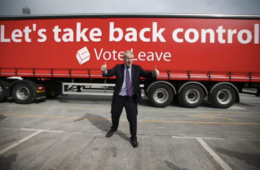 (Then-British prime minister Boris Johnson during the Brexit campaign at Europe Worldwide, a freight company in Dartford, on March 11, 2016. Peter Nicholls/Reuters)
