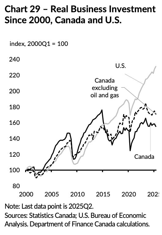This week’s budget covers many weighty topics. But Canada’s economic predicament is summed up most pithily by a single chart appearing on page 55 of the main document. This graphic is in a chapter entitled ‘Building a Strong and Competitive Economy: Canada’s Path Forward is to Improve Productivity’. Here is chart 29 from the 2025 federal budget, with all its simple candour: