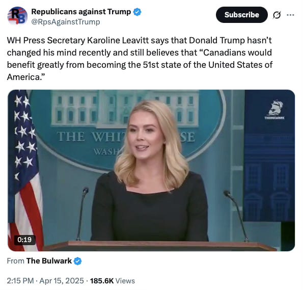 Official US threats to Canadian sovereignty are back in the news. In response to a question from CBC reporter Katie Simpson at an April 15 press briefing, White House press secretary Karoline Leavitt revisited Trump’s hostile claims:
