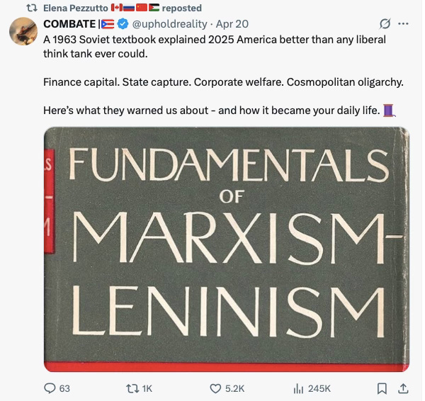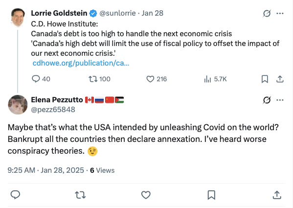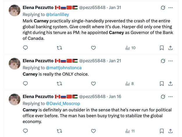 At one point, Carney is termed ‘perfect’. In other posts, Carney is praised for honesty, for standing up to Trump and for understanding indigenous issues. (At one point, ‘Elena Pezzutto’ claims to be ‘half Ojibway’.) Carney is encouraged to nationalize Alberta oil and gas, penalize Alberta Premier Danielle Smith and drop support for Ukraine, NATO, the EU and Israel. The account advocates leaving NATO.