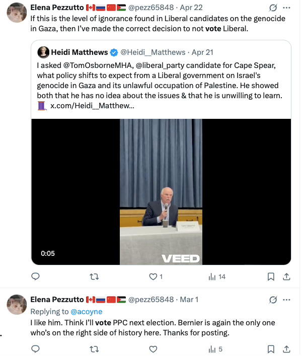 Over the course of the Ontario election campaign, @pezz65848 was against Ford (and the Ontario Liberals), and quietly pro-NDP. They criticized Poilievre for having ‘no skills/no brain’, for being ‘dangerous’, for ‘never having held a serious job’, and for refusing to obtain a security clearance. Then there is this for Carney: