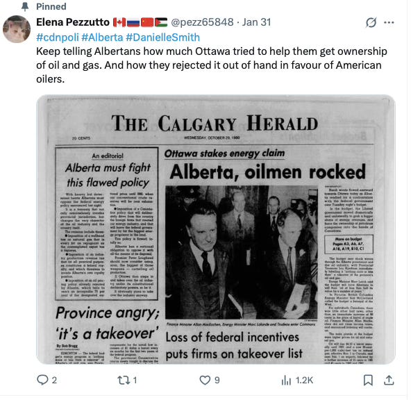 It states at one point that Smith “needs to be removed from power.” A pinned tweet recalls Pierre Trudeau’s 1980 National Energy Programme that Albertans rejected — in a tellingly un-idiomatic phrase — “out of hand in favour of American oilers”:
