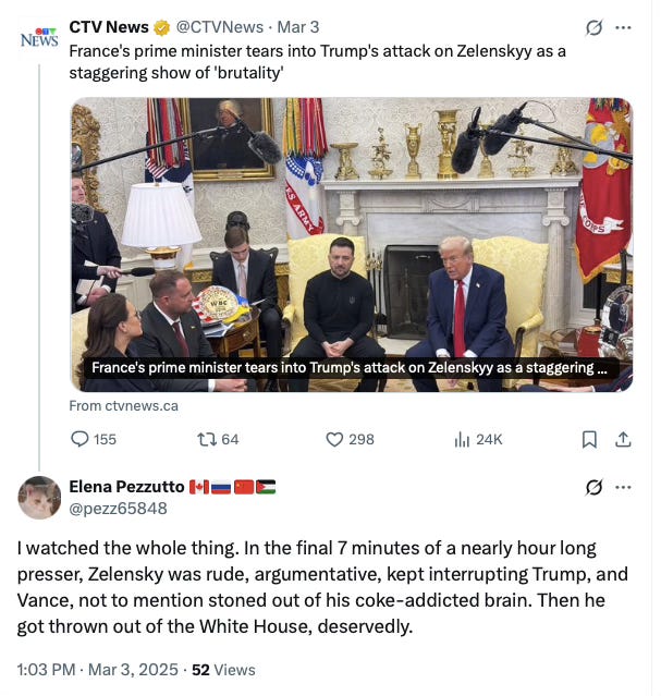 To keep up appearances, the account criticizes Trump’s ‘economic warfare’ and threats of ‘annexation.’ Yet when Trump and Vance ambushed Zelenskyy in the Oval Office, @pezz65848 (as a loyal Russian asset) took the White House side: