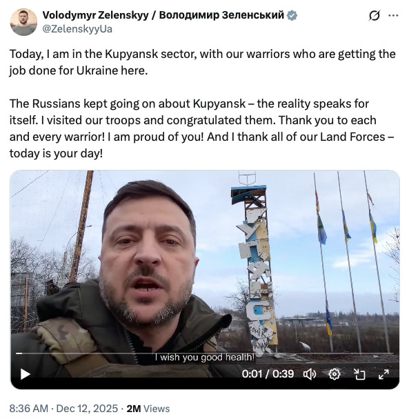 (Ukrainian president Zelenskyy three days ago in Kupiansk, which Russian generals had falsely claimed to have taken in a briefing with ‘Putin’)