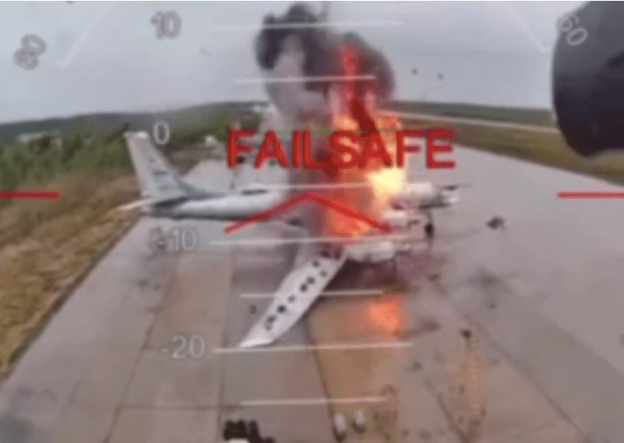 (Russian Tupolev 95MS strategic bomber under attack by Ukrainian drones.)