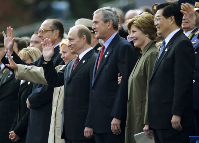 But in 2005, even after Moscow levelled Chechnya and backed Iran’s proxies in Iraq, US president George W. Bush, France’s Chirac, Germany’s Schröder, Italy’s Berlusconi and Japan’s Koizumi came to Moscow on ‘Victory Day’.