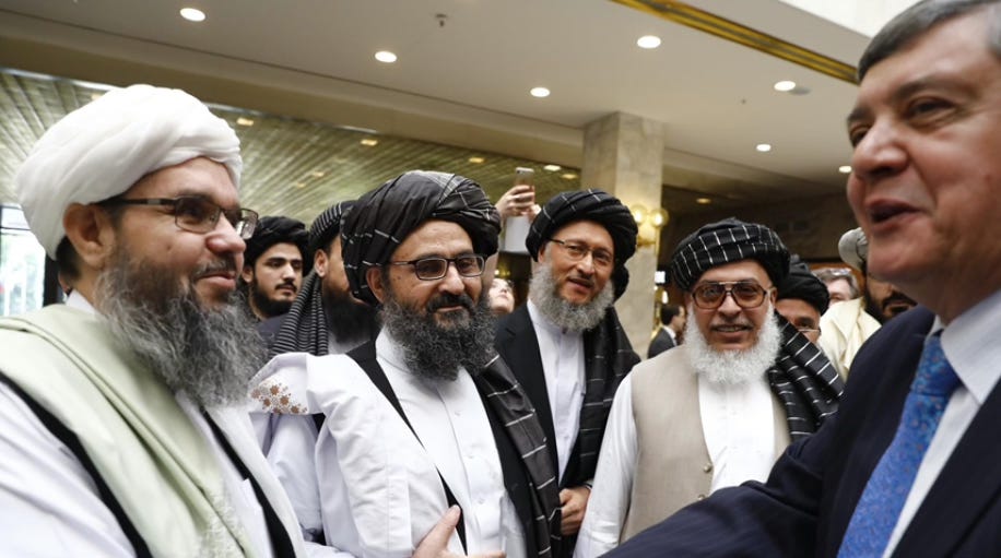 (Taliban leaders Mullah Abdul Ghani Baradar (centre), accompanied by then head of political office Sher Mohammad Abbas Stanakzai (second from the right) meet Russian diplomat Zamir Kabul (right) on May 28th, 2019 in Moscow. Baradar is now deputy prime minister and Stanakzai deputy foreign minister in the illegal and illegitimate Taliban terrorist regime that took Kabul by force in 2021.)