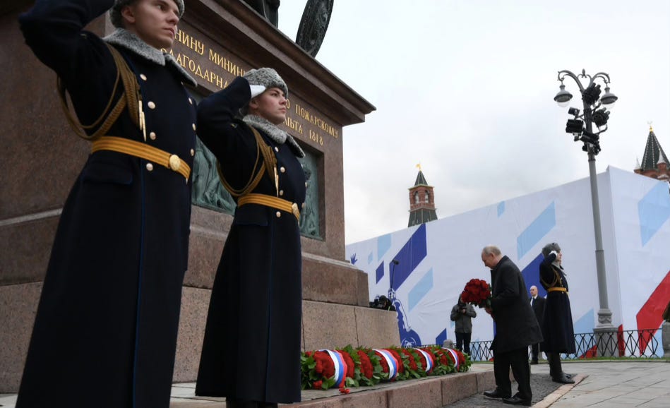 (‘Putin’ lays flowers at the foot of the Minin and Pozharsky monument on Red Square in Moscow on November 4th, 2025)