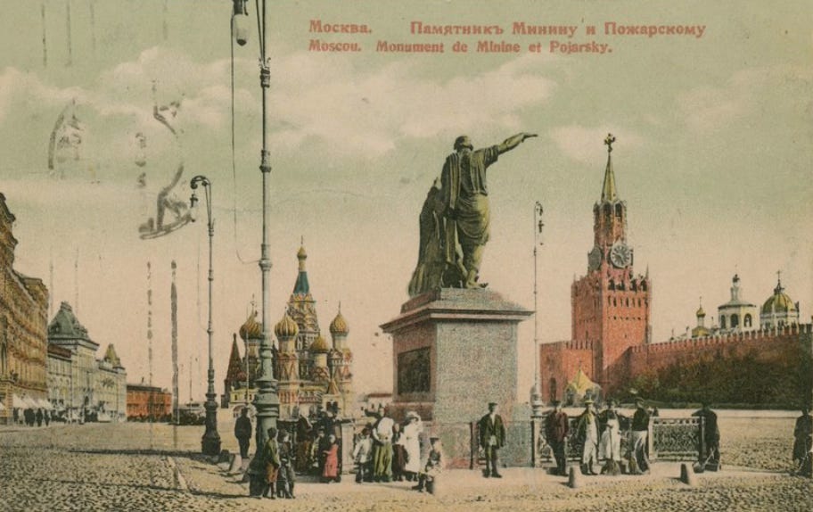 (A postcard showing the Minin and Pozharsky monument of Red Square in 1913)